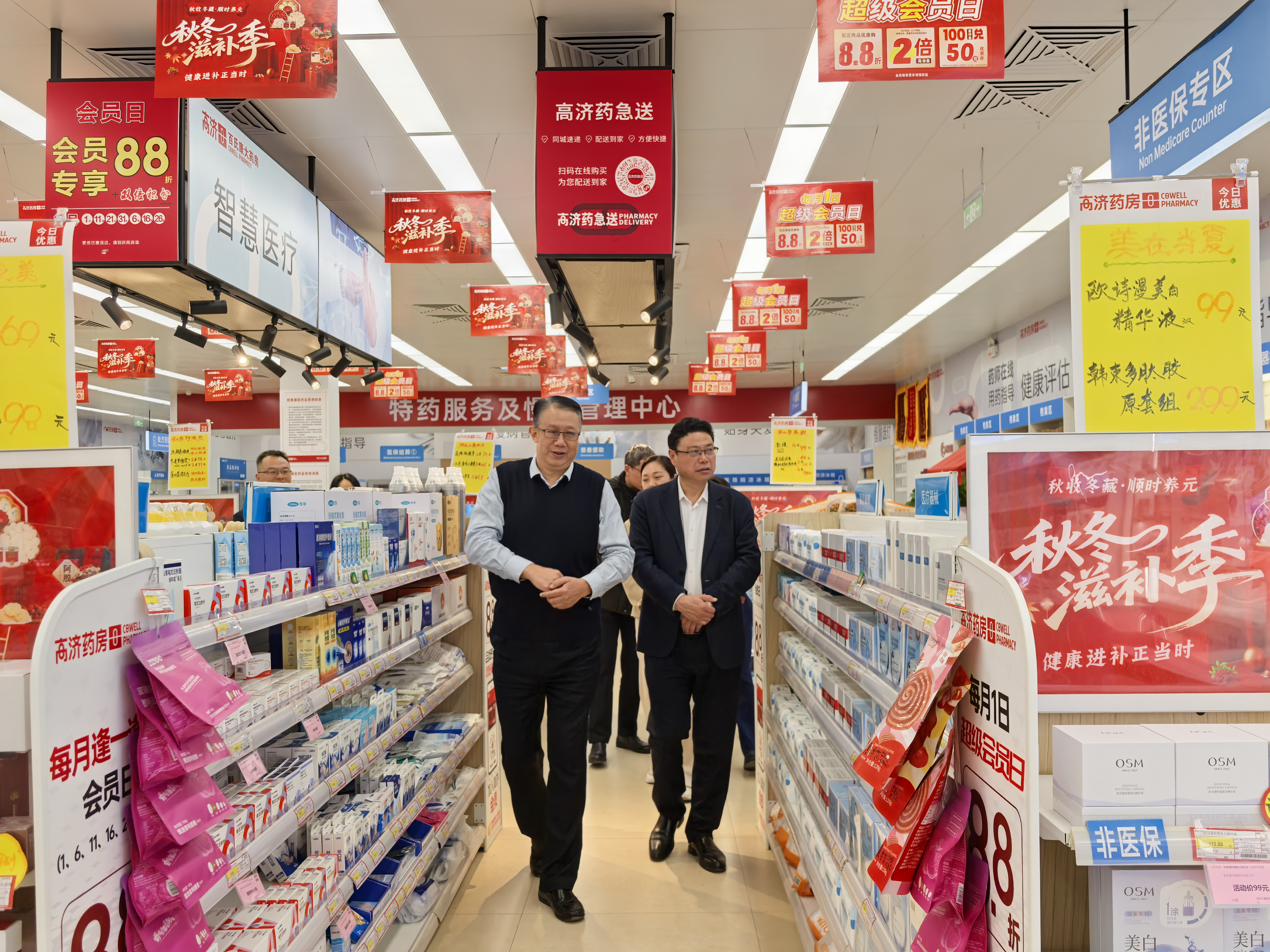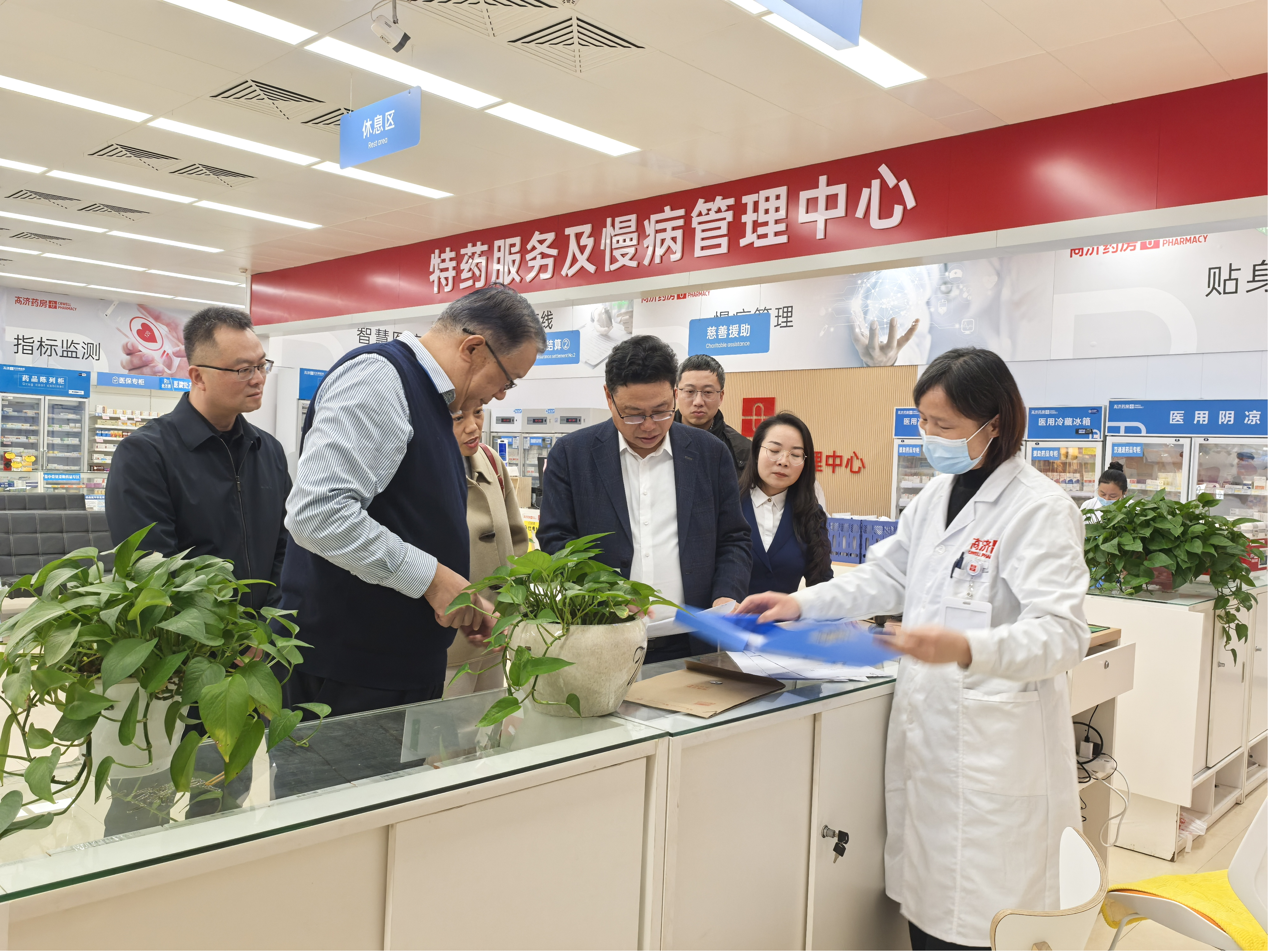 在高济百氏康医药连锁有限公司董事长陈峰、总经理张亚楠等企业领导的陪同下,魏新华一行实地参观了公司中心店,通过现场观摩与讲解,直观感受了医药零售行业在健康服务领域的创新发展态势。